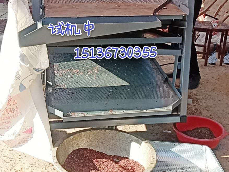 工作原理:本机上下筛由主轴偏心轮驱动做平面振动,把由料斗进行脱粒处理后得花椒进行筛选,由上下筛配合运动,对花椒的进行分级去杂处理,经处理优质花椒由上筛晒出,其余花椒由下筛筛出,其中椒杆、椒叶尘土等有下筛筛出,椒籽和小椒通过下筛筛出后经过风机进一步风选分离,使筛净率大大提高。花椒籽先经过进料口处风机抽风,直接抽走重量轻的灰尘,花椒叶,梗,杂质等。上层的初次筛分在把大杂清理过,没有杂质的花椒直接落到下层筛网上,下层筛网会把花椒里的黑子,尘土有缺陷的花椒直接漏掉,没有杂质的花椒会从出料口筛分开出来。
