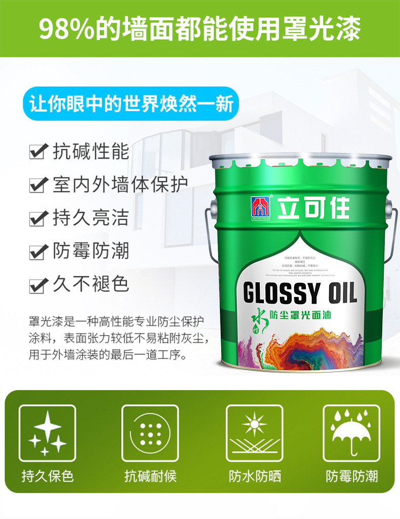 立可住水性透明罩光漆 外墙工程罩面漆 罩光漆是一种高性能专业防尘防护层涂料 表面张力较低不易粘附灰尘 用于外墙保护具有耐候性耐水性保护外墙特久亮丽等特点 现货供应 欢迎订购