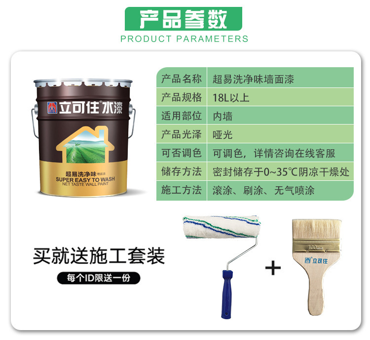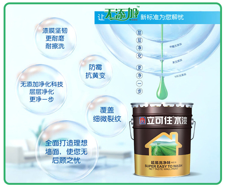 特色服务 : | 厂家负责施工技术指导 | 超易洗环保墙面内墙漆 : | 立可住超易洗环保墙面漆 内墙墙面漆 |