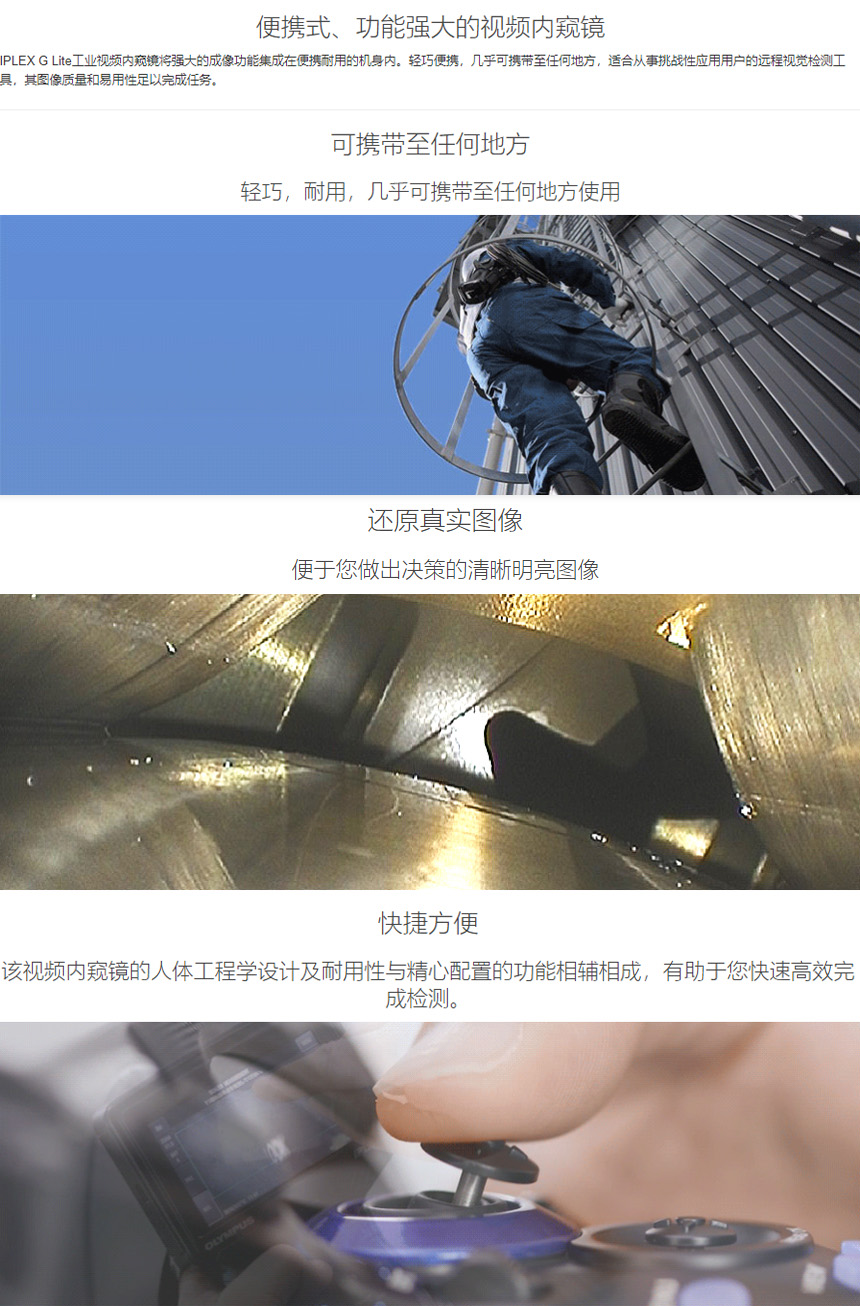 IPLEX G Lite工业视频内窥镜将强大的成像功能集成在便携***的机身内。轻巧便携,几乎可携带至任何地方,适合从事挑战性应用用户的远程视觉检测工具,其图像质量和易用性足以完成任务。