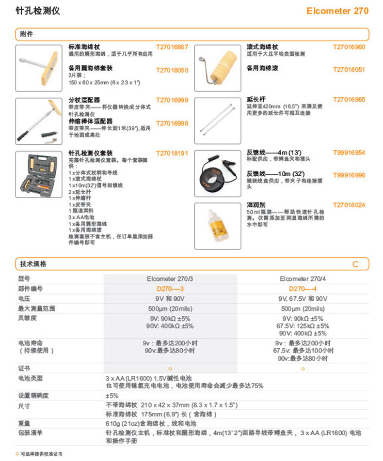 包装清单 针孔检测仪主机,标准杖和扁形海绵,4m(13’2”)回路导线带鳄鱼夹,3 X AA(LR1600)电池和操作手册