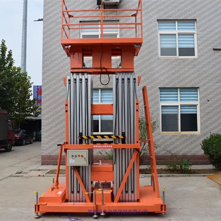 双立柱铝合金升降机:全新设计的新一代产品,整体采用高强度铝型材精制而成由于型材强度高,使升降台的偏转与摆动极小。采用双桅柱式结构,载重量大,平台面大,稳定性极好,运转灵活,推行方便。它轻盈的外观,能在极小的空间内发挥理想的举升能力。该升降机广泛用于厂房、宾馆、大厦、商场、车站、机场、体育场等。可用作电力线路、照明电器、高架管道等安装维护,高空清洁等单人工作的高空作业。