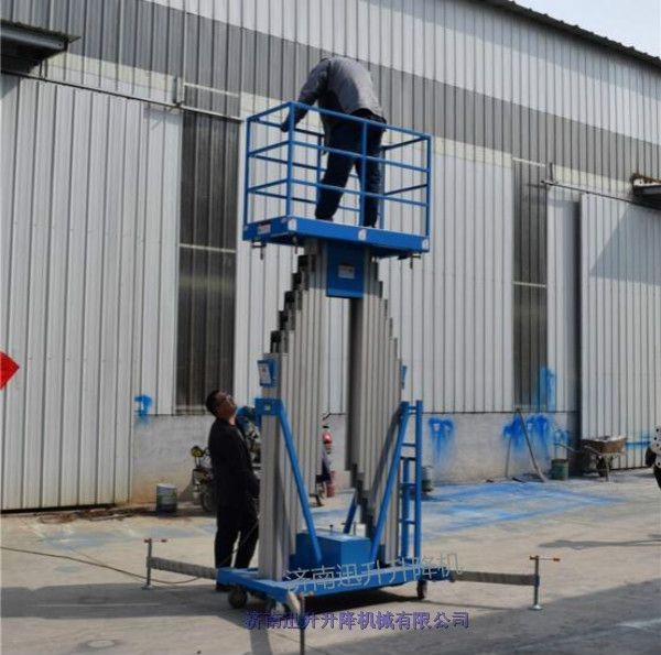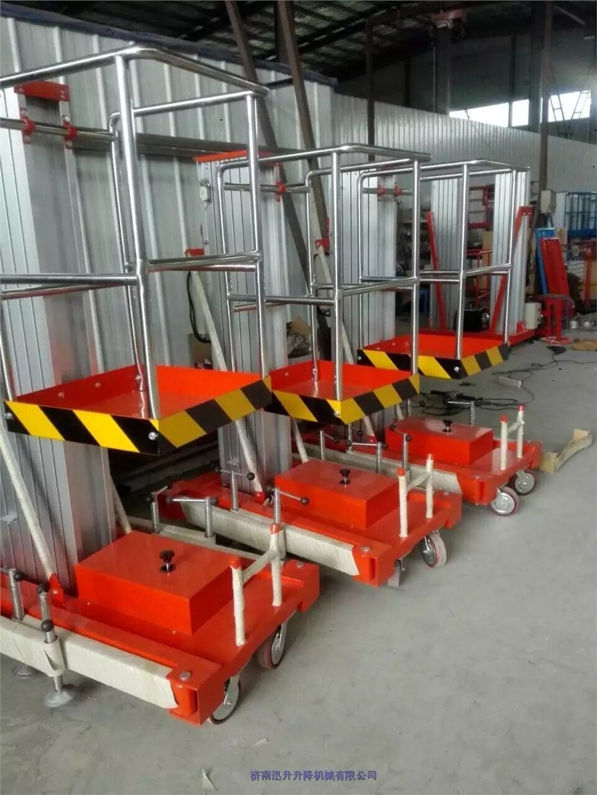 三立柱铝合金升降机:三组桅柱支撑作业平台同步升降,支退结构同单桅柱式平台,具有超大的载重量的工作稳定性。整体升降式护栏装置,强度好,运输时大幅度地降低整机高度,装卸十分方便,通过一次升降即可完成装配或拆卸。该升降机承载能力强,适合于两人(可携带一定的重量工具和材料)同时登高作业;还可根据不同环境订制成各种非标产品,以满足不同需要。