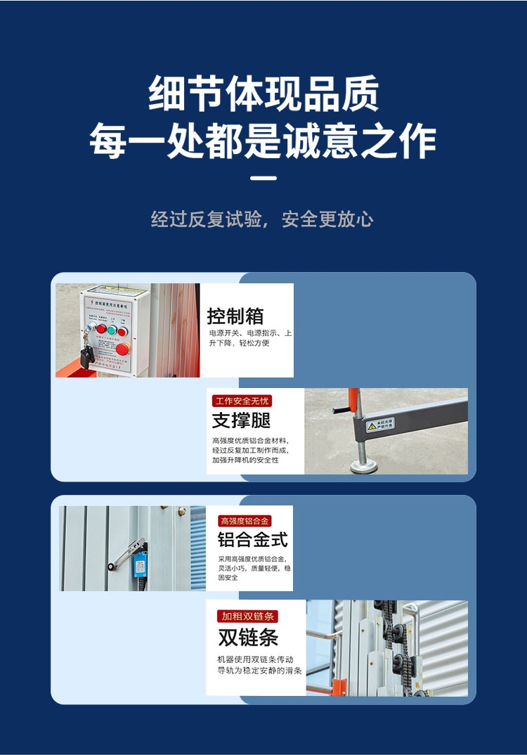铝合金升降机根据升高分类可以分为单桅柱铝合金升降机、双桅柱铝合金升降机、三柱铝合金式升降机、四柱铝合金式升降机和多柱铝合金升降机,铝合金升降机采用高强度航空铝材精制而成,由于选用铝合金材质属于国标材质,强度高在设备升起来作业中偏转机摆动极小,
