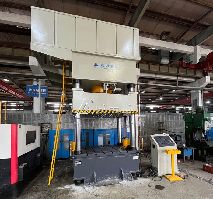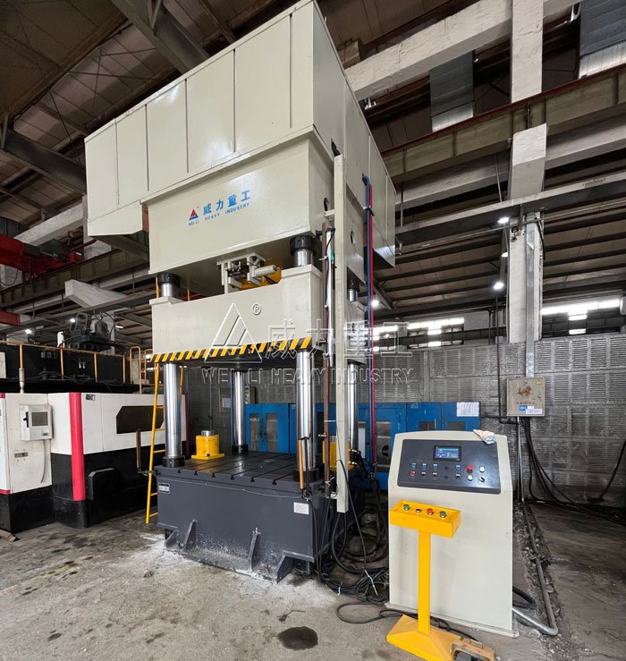 315吨液压机(四柱油压机、压力机)是山东威力重工为客户自主研发生产设计的,采用三梁四柱结构,四根立柱和三个台面组成一个刚性框架,抗偏载,配备自动润滑装置,可以保持精度,保护立柱,延长设备使用寿命,还配备可编程的PLC控制系统。设备由主机及控制机构两大部分组成,通过管路及电气装置联系起来构成整体。主机部分包括机身、主缸、限程装置等。控制机构包括液压泵站(动力系统)、电器箱、移动操纵台等组成。