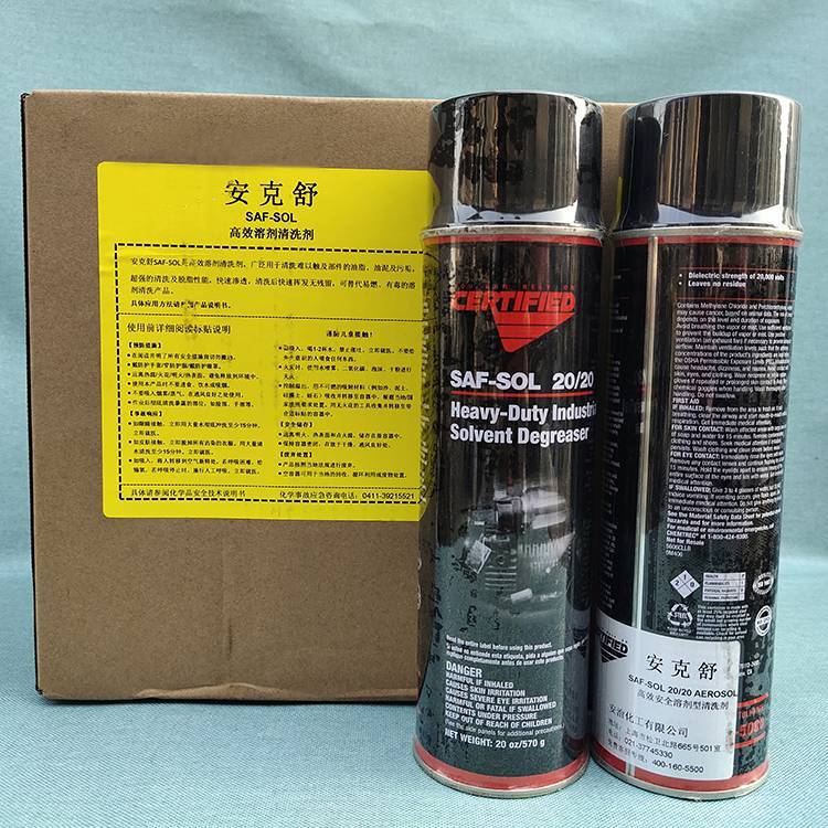 安克舒SAF-SOL高效安全型电气设备清洗剂。介电强度高达25,000V,可高效清除油脂、污垢、潮气等杂质,完全挥发。快速渗透,去除难以触及部件的油脂、油泥及污垢。无腐蚀性,不会损害大多数金属、轻合金或镀金饰面以及大多数塑料或涂料,的清洁能力,对重油污、油脂、原油、渣油、沥清有的去除效果,清洗后快速挥发,可替代易燃、有毒的溶剂清洗产品。