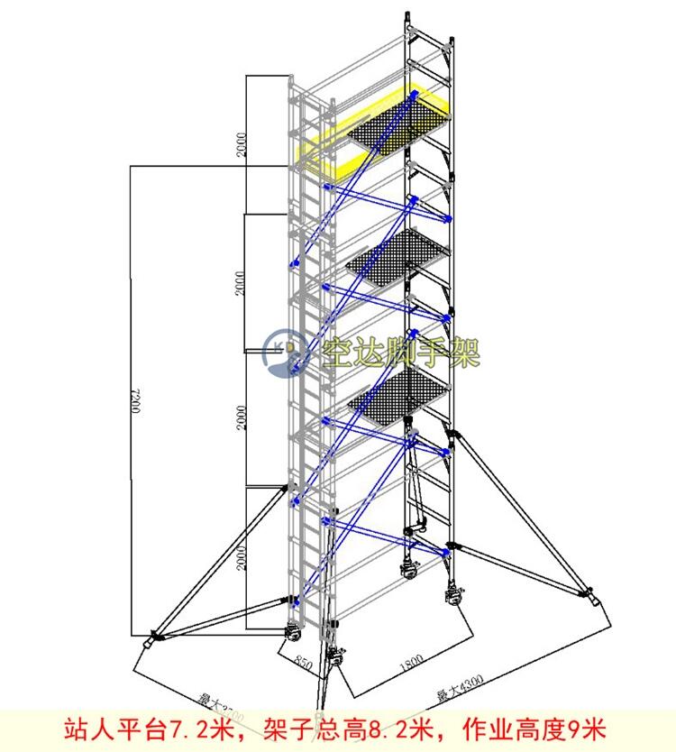 深圳空达铝合金脚手架经过仔细考虑的每个细节,单个组件的数量少以及重量轻确保了在施工现场的安全组装。可以保证操作者的安全,整体上多采用水平铝制管装配,可根据客户要求,空达公司可免费为您定制施工方案。
