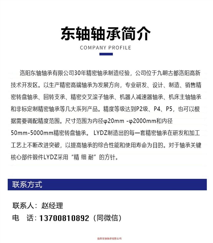 洛阳东轴交叉滚子转盘轴承由两个座圈组成,滚动体是交叉安排的滚子,这样既能节约空间,又能同时承受轴向力、径向力,广泛用于斗轮机,超重运输机械,港口机械,采掘机械,建筑工程机械,公园游艺机,灌装机和发射架等大型回转装置上。