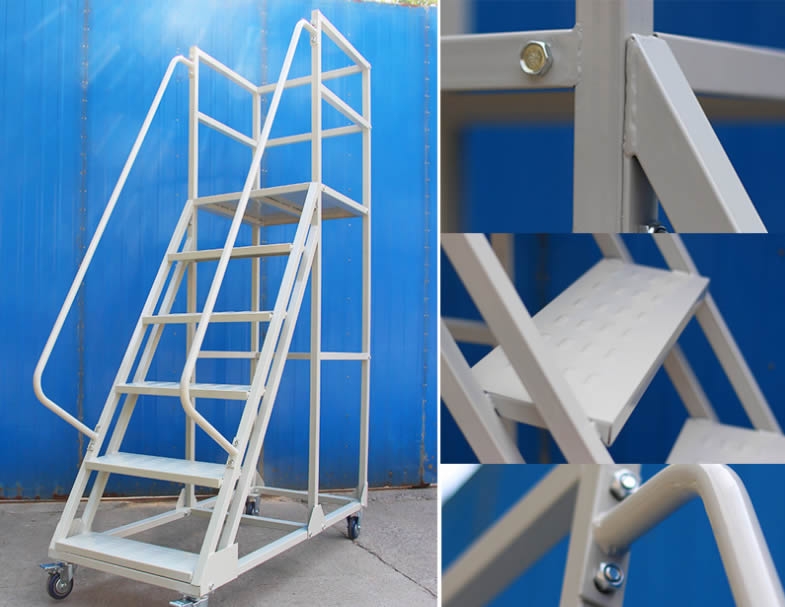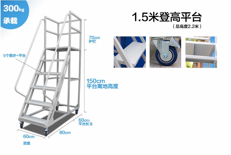 2.登高车采用钢材制造配以脚轮可以灵活移动。2个PU万向轮,2个PU带刹车万向轮,稳固。