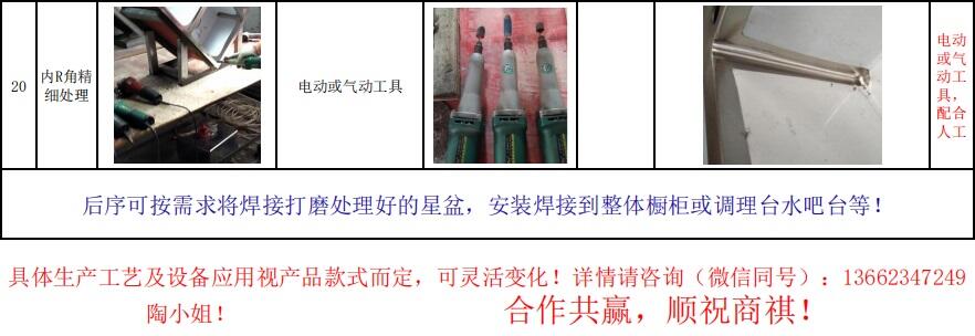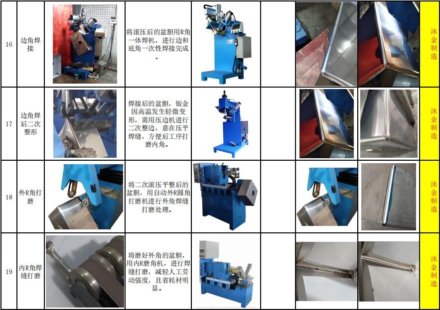 拼料水斗生产设备及模具:直缝焊机、拼板焊缝滚压机、直缝焊打磨机、剪角模具、八分之一模具、下水孔模具、压边角一体机、自动焊角机、压边机、外(阳)角打磨机、内(阴)角打磨机。
