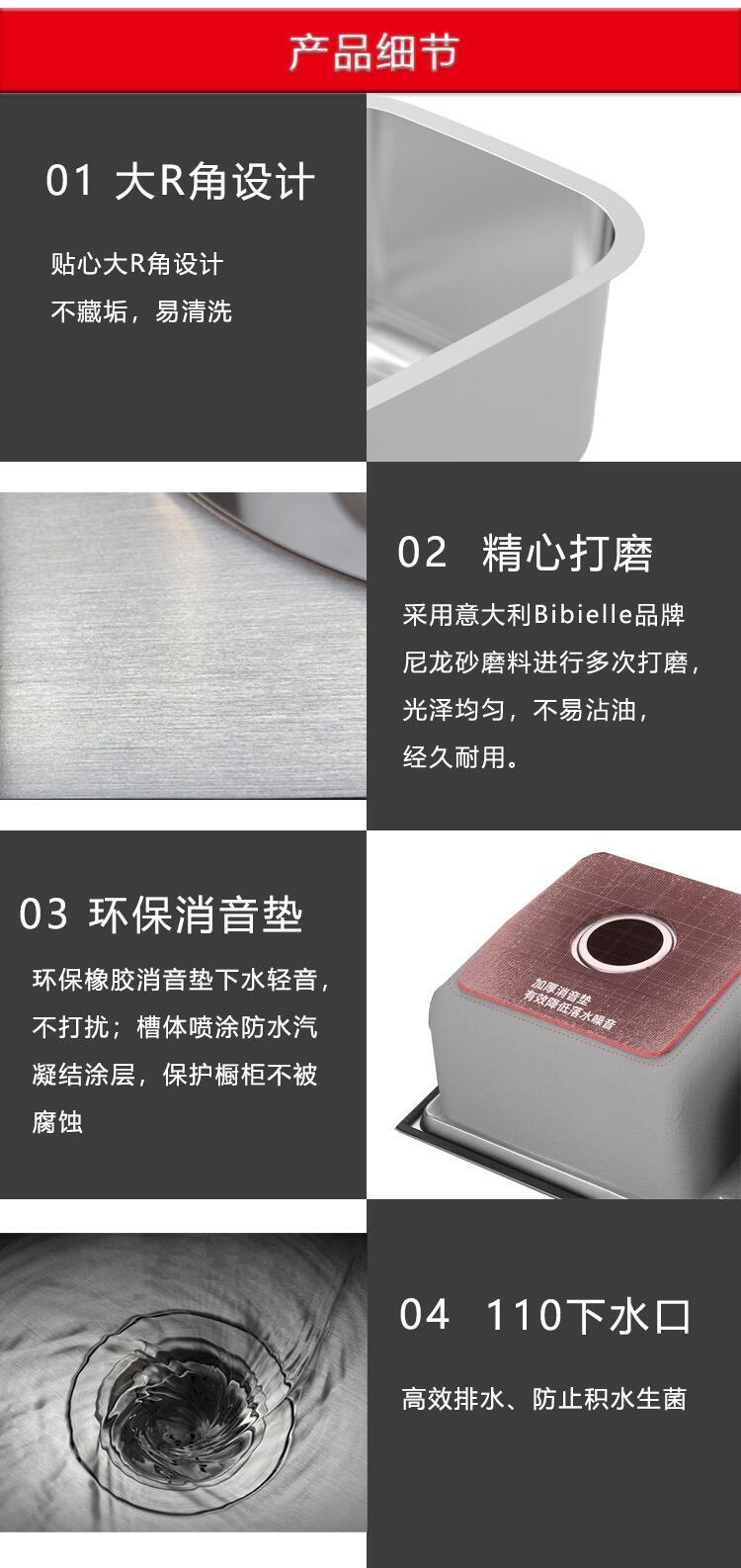 水槽实标实厚,台下安装,水槽容量大,外观简约大气,有专门技术安装指引,快捷无渗漏,减少安装造成的水槽磨损。