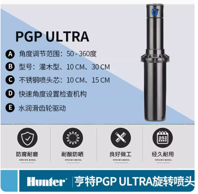 PGP Ultra在PGP喷头的基础上,集三十多年的研究、客户反馈和实验室测试,增加了全新功能。 PGP Ultra有改进,是其不脱齿防损坏驱动机构和自动角度恢复。这两个功能,使得喷头旋转塔被人为转动时不会造成齿轮损坏,并且会返回到其原始角度设置位置,而不管旋转塔被转到什么方向。其它功能包括具有不同射程的34个喷嘴选择,以及顶部调节槽头螺丝。