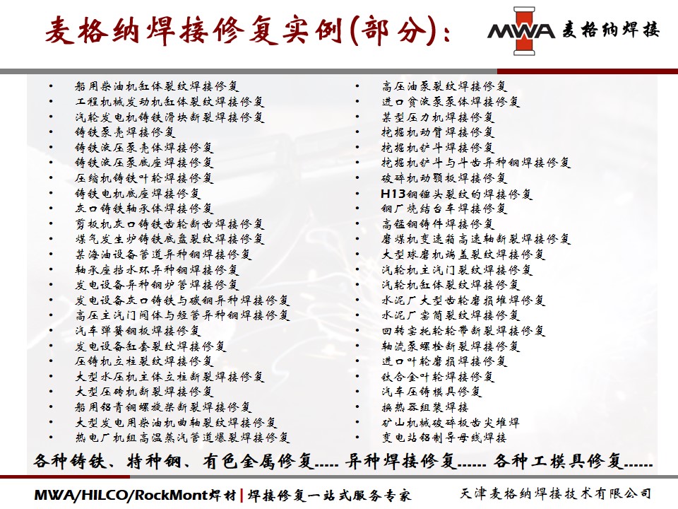 各种铸铁、特种钢、有色金属焊接修复..... 异种焊接修复...... 工模具焊接修复.....
