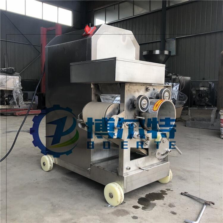 鱼糜采取机 虾壳分离机 全自动去鱼骨机大鱼和小鱼的采集过程略有不同,大鱼的加工时,人工把待加工的鱼先去掉鱼头和取出鱼肚中的内脏;需将鱼剖分成两半,漂洗 干净(避免采出来的鱼浆被内脏及鱼血污染),想要提高产能,也常搭配全自动杀鱼机进行使用。随后将鱼片投入到料斗内(鱼的剖分面朝向采取筒,背 部贴近橡胶带),鱼在橡胶带的带动下进入采取筒与橡胶带的挤压区,在橡胶带与采取筒之间的挤压力的 作用下,鱼肉被挤压通过采取筒上的小孔进入采取筒内,采取筒内的鱼肉碎粒会随着旋转自动送出。而 鱼皮及鱼刺等杂物则被装在机器上的刮刀从采取筒外延上刮下落在收集槽中。