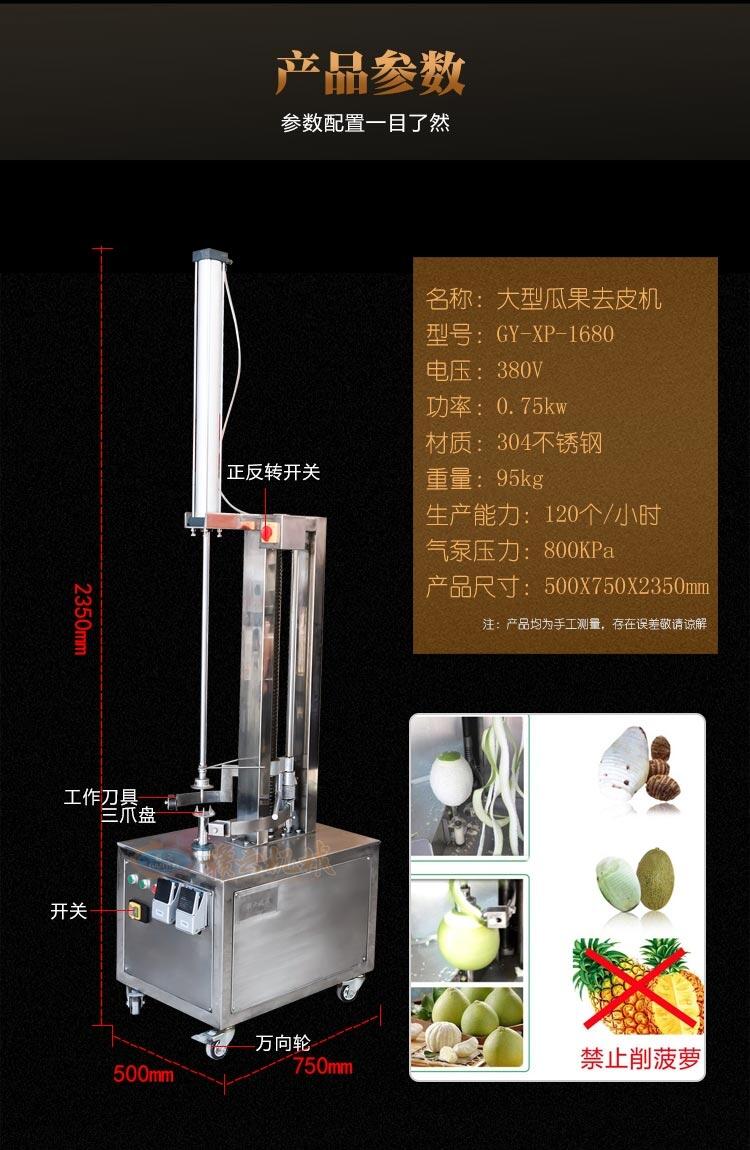 电动不锈钢大型瓜果去皮机适用于木瓜,南瓜,冬瓜,哈密瓜,柚子等大中型瓜类削皮,削皮厚薄可调。刀组上下循环削切效率高,去皮率高达95%以上。削皮刀架特殊设计,可使瓜皮定向排出,方便收集清理。机器拆洗方便,使用时操作简单,清洗方便,安全卫生。去皮机适用于餐饮行业,饭堂,食品加工厂,冷冻食品厂,休闲食品厂,西餐店设备,饮品店设备,茶餐厅等。防水开关,可调厚度,钢质刀片耐用不生锈。它是大型工厂、学校、伙房等食堂理想的去皮工具。