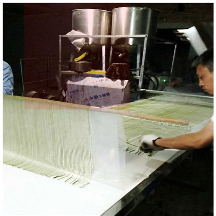 天华粉条机组全自动粉条生产线为机电一体化设计,操作简便,安全卫生,由工作台、不锈钢搅拌和浆机、粉条成型机、皮带输送机和电机组成,采用智能控温新工艺熟化成型方式,仪表显示温度,使淀粉糊化温度恒定,加工粉条不用明矾不加胶,电热自熟不烧煤,无烟尘排放,干净卫生,生态环保,节能省工,且粉条粉丝筋道,下锅不糊,提高了粉条粉丝的市场竞争力,原料范围广,薯类淀粉及各种粮豆类淀粉米浆都能加工。天华牌粉条机加工产品多样化,粉条粉丝扁粉粉皮酸浆米线东北酸汤子等不同粗细扁圆宽窄换不同的成型模具即可实现。天华全自动粉条生产线采用排线平行出粉工艺,平行出条,条与条之间有间隙,不接触,冷却后即可挑杆晾晒,无需冷冻,无需搓洗分条,一年四季均可生产,它打破了传统做粉方法,开创了免冻免搓洗粉丝粉条的先河,生产简单易操作,淀粉加水和成稀浆倒入机器内熟化成型即可,粉条出机即熟,且相互之间不粘连,漏到接条膜上切断后即可调杆冷却晾晒,抛弃了传统工艺打芡打糊,冷冻搓洗的笨重方法,减轻了劳动力。