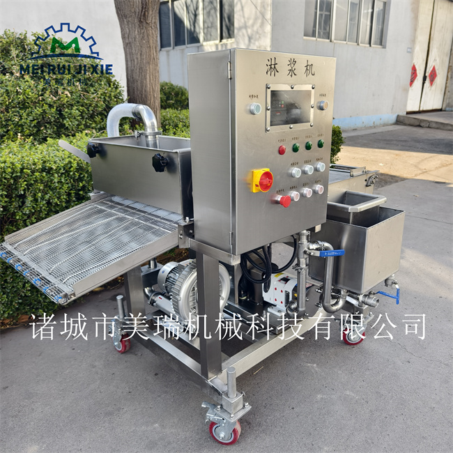 新款锅包肉裹浆机 锅包肉上浆挂糊机器 自动化锅包肉挂面糊设备既有可靠的安全防护,可靠的MITSUBISHI电器件。上下网带间隙可调,产品适用范围广。适用于天妇罗产品、禽肉、海鲜、蔬菜等制品。对立的输出网带可供选择。上浆均匀,每个产品又称潜行式上浆机,是通过强力风机及振动器去除多余浆料。将产品浸入浆液中,符合HACCP要求。都均匀地沾上浆液。从而使产品涂裹上一层天妇罗裹浆。可拆卸设计,便于整机清洗,