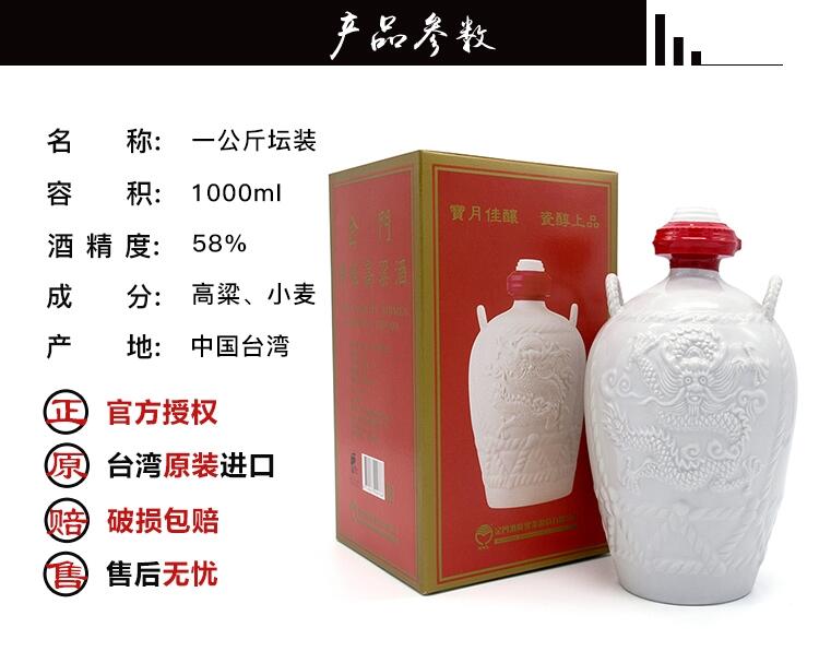 台湾58度1L金门高粱酒坛装小白龙白瓷瓶宝月佳酿清香型