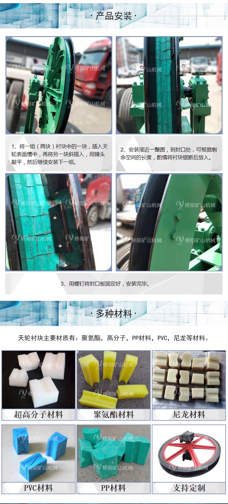 天轮衬块主要材质有:聚氨酯,高分子,PP材料,PVC,尼龙等材料。
