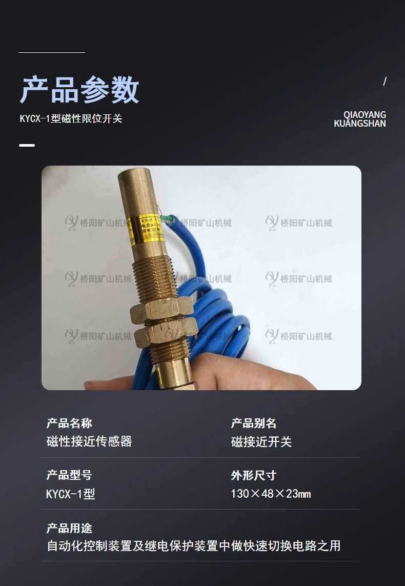 KYCX-1型磁性限位开关,适用于煤矿井下瓦斯、煤尘等危险场所使用(有煤安证),作为井筒提升机减速点,限位停车、过卷保护开关、装卸载闸门、风门控制及巷道运输、矿车计数,推车机、播台还被广泛应用于矿山、机械、轻工、冶金、化工、纺织及科研等部门的自动化控制装置及继电保护装置中做快速切换电路之用。