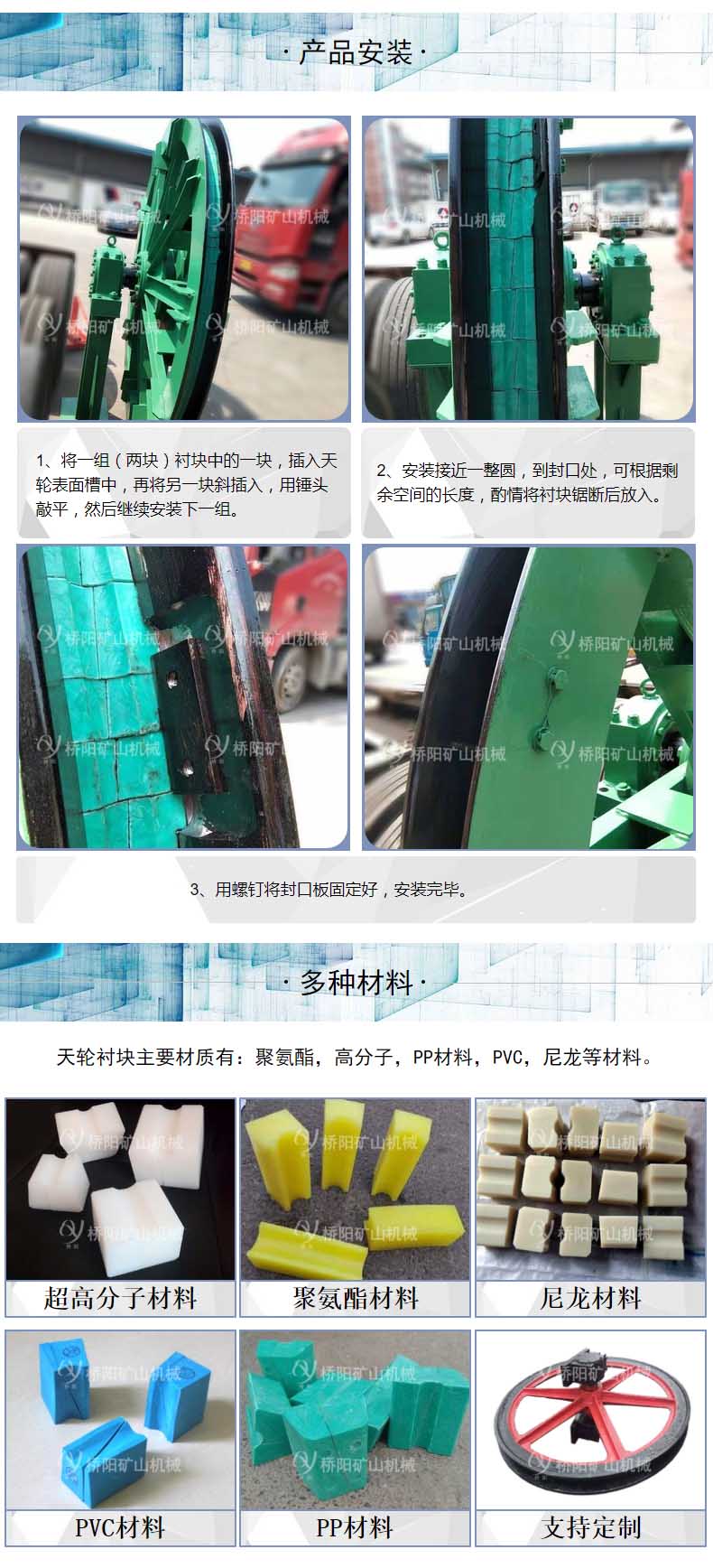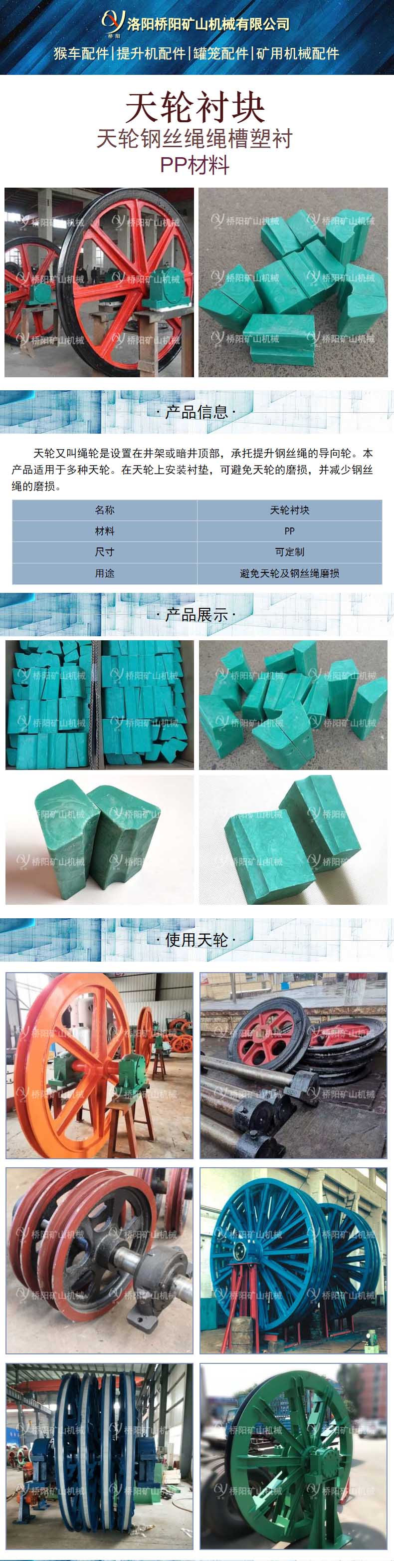 在天轮上安装衬垫,可避免天轮的磨损,并减少钢丝绳的磨损、延长钢丝绳的使用周期,从而降低更换天轮和钢丝绳的工作量。PP天轮衬块的密度较小。主要应用于单绳矿井提升机上。PP天轮衬块消除了现有部分天轮因无绳槽衬垫导致绳槽磨损而更换整个天轮的大量工作。本产品为两半楔形结构,装拆方便。
