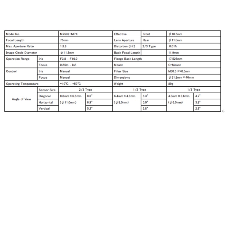 M7538-MPX Computar 1600万2/3英寸75mm工业镜头 镜头焦距75mm 靶面尺寸2/3英寸 光圈范围F3.8 ‐ F16.0 手动光圈手动聚焦 对焦范围0.25m ‐ Inf  工作温度-10℃ ‐ +50℃ 低畸变0.01% 后焦距11.9mm 安装C接口 尺寸φ31.8mm×46mm 重量89g M7538-MPX
