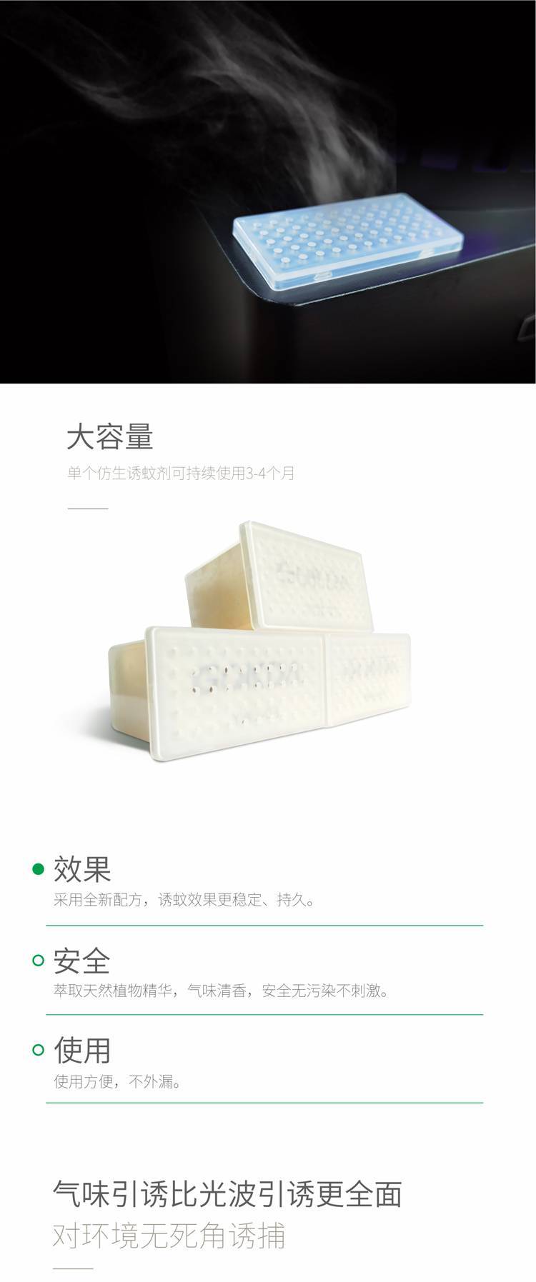 产品特点:安全、环保,天然植物精华提取物和人工合成的对特定昆虫幼行为引诱作用的活性物质.