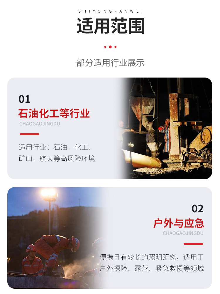 适用场所 | 铁路、航运、部队 、警察和工矿企业及各种野外工作场所作移动照明和信号指示 | ||