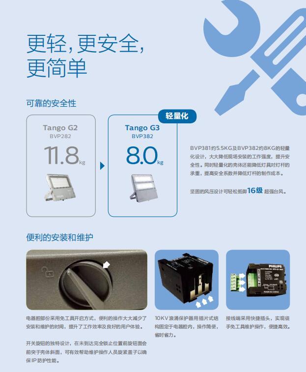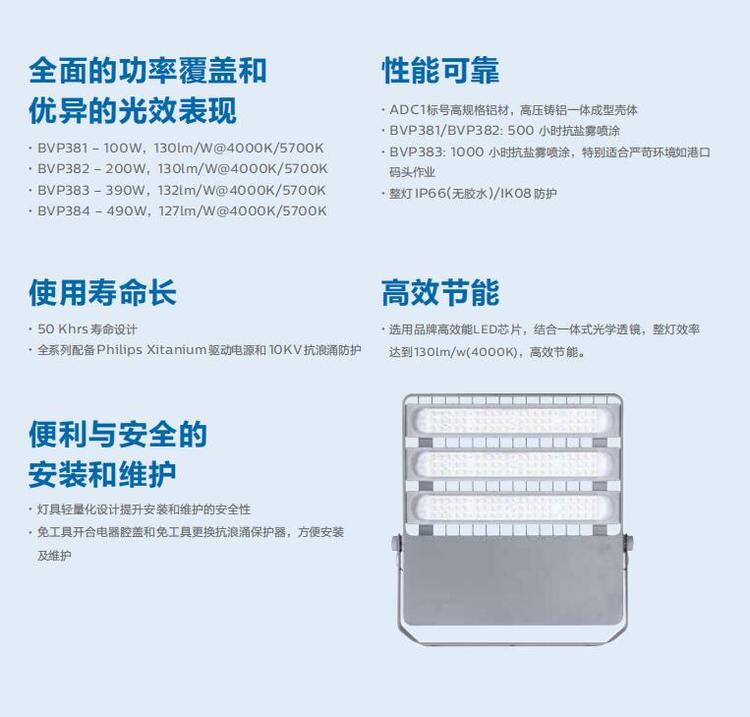 飞利浦全新推出BVP384系列LED投光灯,以高效成熟的LED技术,稳定可靠的性能,便捷的安装于维护,超值的性价比,为用户提供完美的泛光照明解决方案。