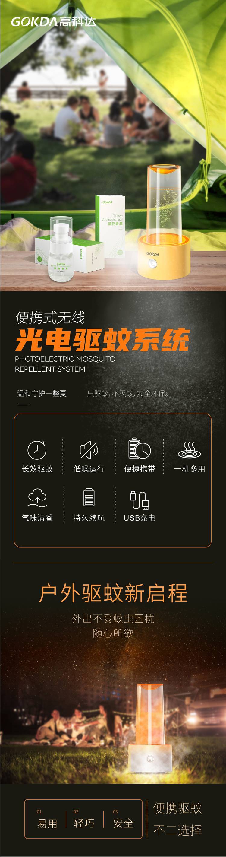 户外:在户外可以采用光电驱蚊系统搭载GOKDA植物香薰进行驱赶周边蚊虫;
