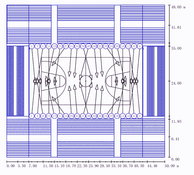 举例:场馆长度50米,宽度48米,带观众席,采用马道安装方式,净空高度15米,照度设计为专业比赛,非电视转播要求,采用FS-QC0869-300W LED球场灯