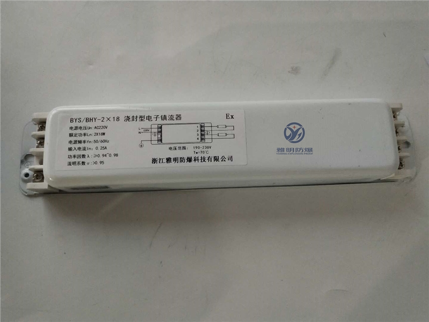 本公司研制生产的雅明防爆BYS/BHY-1*36W*2*36W浇封型电子镇流器主要应用于安装40W双管单脚荧光灯(T8、T12)的荧光灯具的装置。