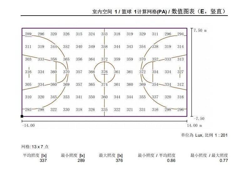注:以上数据表明,篮球场平均照度337lx,可完全满足训练娱乐活动照度要求。