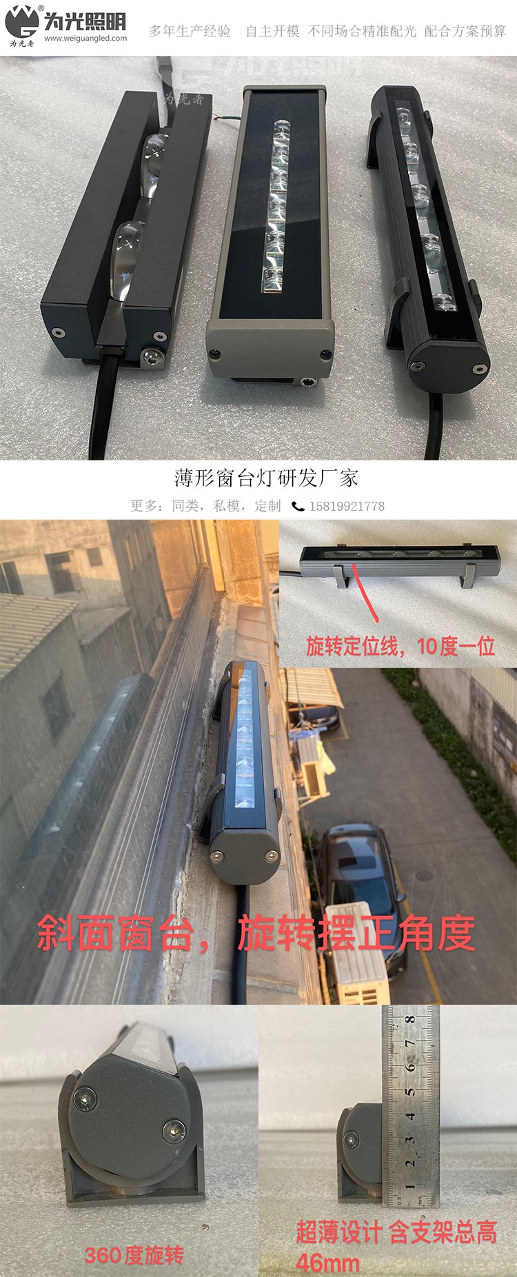 特点:薄型矮灯体不凸起,白天隐身性强同时不影响窗户开关,不锈钢旋转支架、方便斜面窗台摆正发光角度达到理想照明效果,可根据不同框形状,不同尺寸、匹配不同角度和不同功率。