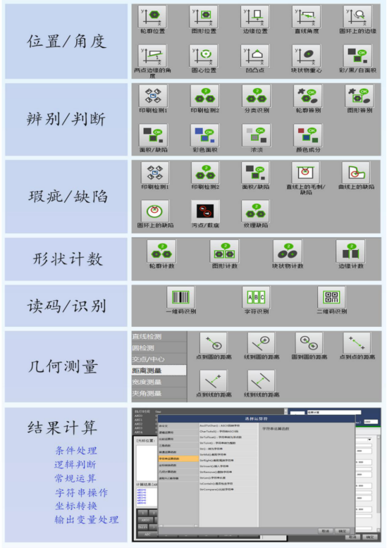 定位引导(轮廓,圆心,边缘等) 外观缺陷(有无,辨色,印刷,纹理,划痕等) 读码识别(二维码,一维码,OCR) 几何测量(点,线,圆之间宽度,距离测量) 带命令文的逻辑运算计算器 |