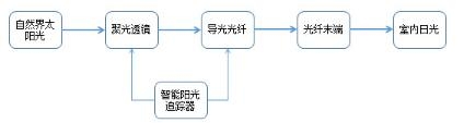 光纤导入阳光照明系统是利用室外的阳光透过采光罩后通过对太阳光汇聚进入到照明光纤中进行重新分配,经过光纤传输后照明灯具把自然光均匀高效的照射到室内;同时阳光跟踪器根据太阳的位置信息,驱动转动机构驱动光纤时刻正对太阳,从而保证带来室内照明的良好效果。