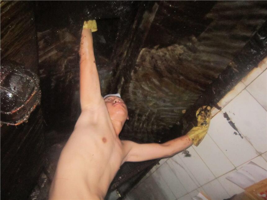 1、烟罩及烟道清洗后90%以上可以见到烟道原有的内壁铁皮色,不残留块状顽固油污。