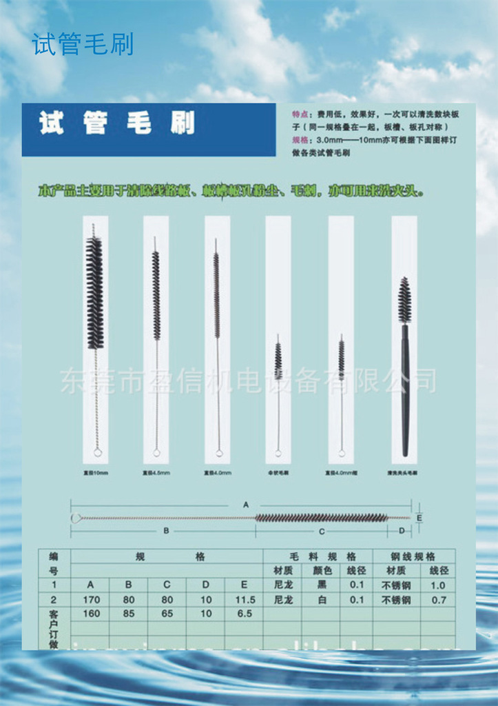 东莞市盈信机电设备有限公司采用国内外先进设备,专业生产适合线路板(PCB)行业所需要的钻铣机夹头、压力脚毛刷、试管毛刷(通条)钻孔机配件(刀座/刀盘/压脚片)、成型机零配件,板槽清洁耗材等。试管毛刷(通条刷):本产品用于锣板、钻孔后处理,即线路板经成型、钻孔之后,板子上面的槽、孔中间残留一些粉尘、毛刺,这时就可以用试管毛刷(通条刷)来处理。规格:毛刷直径3.0mm; 4.0mm; 4.5mm; 5.0mm; 5.5mm; 6.5mm; 7.5mm; 10mm.先进精良设备和实践经验,确保我们产品满足各类印制板厂商的质量要求,提供及时、周到、真诚的服务,与您携手发展PCB事业!价格优惠,欢迎广大商家前来洽谈,订购!
