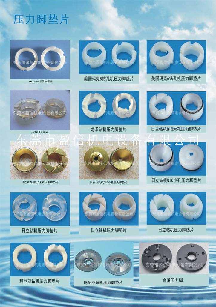 东莞市盈信机电设备有限公司采用国内外先进设备,专业生产适合线路板(PCB)行业所需要的钻铣机夹头、压力脚毛刷、试管毛刷(通条)、钻孔机配件(刀座/刀盘/压脚片)、成型机零配件,板槽清洁耗材等。国内外各款钻孔机之压力脚垫片,亦可根据客户要求定做各类压力脚垫片。钻孔机之压力脚垫片,包括日立、东台、Schmoll、天马、龙泽等知名品牌。先进精良设备和实践经验,确保我们产品满足各类印制板厂商的质量要求,提供及时、周到、真诚的服务,与您携手发展PCB事业!价格优惠,欢迎广大商家前来洽谈,订购!