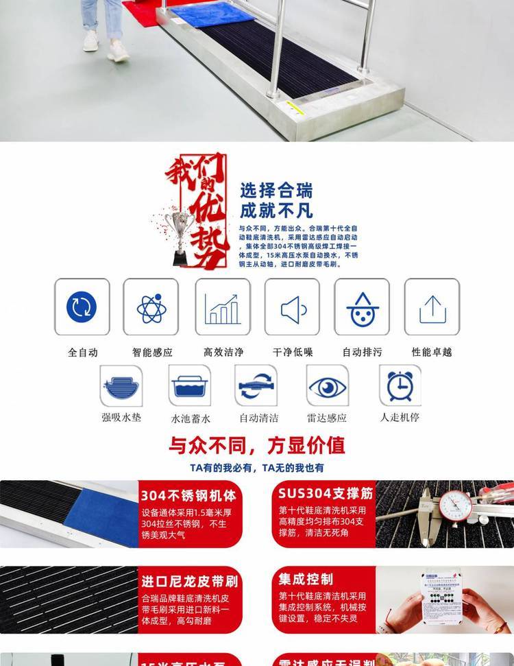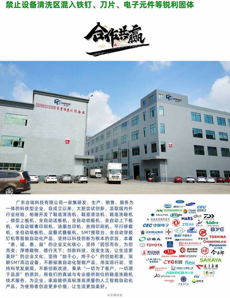 合瑞科技坚持以科技为根本的宗旨,本着“亲、诚、惠、容”的企业文化核心,坚持“因您而在,为您而变;厚德载物,德行天下;科技,改变生活,让生活更美好”的企业文化,坚持“始于心,终于心”的创始初衷,深耕SMT周边设备,不断探索自动化智能产品,用实际行动,坚持科学发展观,不断改进,秉承“一切为了客户,一切源于品质”的原则,用我们的真诚与提供到位的鞋底洗鞋机技术服务,为企业、家庭提供高标准高质量的人工智能自动化产品,为使用者创造更多价值,让生活更加美好。