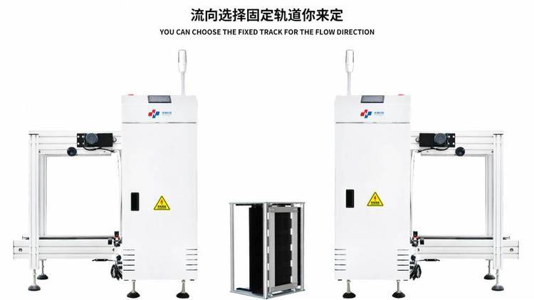 全自动上板机应用于SMT生产线的送板工作,通过更换料框进行送板。装好电路板的料框放置于全自动送板机平台,在操作屏幕页面开启全自动模式后,在接收到下游设备型号后就可以自动更换料框进行送板。