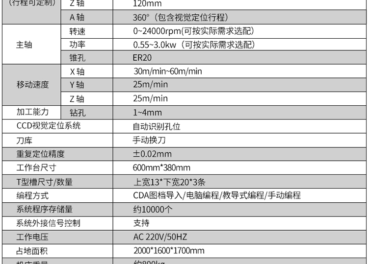 XYZA四轴有效加工行程 | X轴:600 Y轴:400 Z轴:120mm A轴:360° | ||