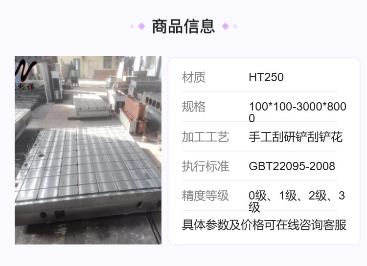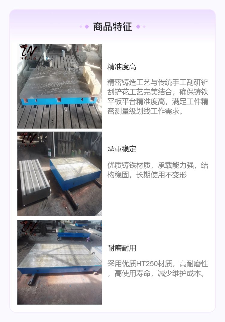 铸铁平板铸铁平台经机械加工后手工刮研铲刮铲花制造而成,工作面硬度:硬度为HB170-240。经过两次人工处理(人工退长600度—700度或自然时效2—3年),铸铁平板铸铁平台材质:高强度铸铁HT250。
