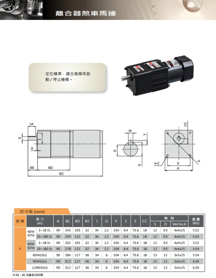 馬達加裝離合剎車器,剎車反應時間最短,可頻繁的啟動停止,具位置保持的功能。