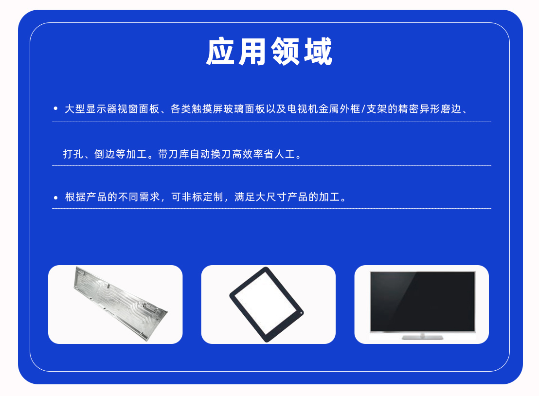 应用用于 | 显示屏视窗触摸屏玻璃面板金属边框磨边打孔倒边等精加工 | ||