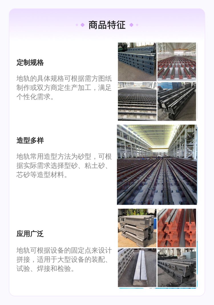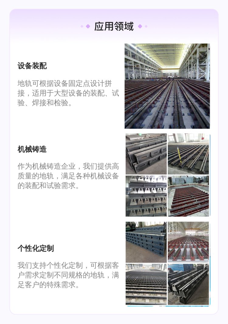 地轨的用途:根据设备的固定点来设计、拼接成铸梁平台,主要用于大型设备的装配、试验、焊接和检验