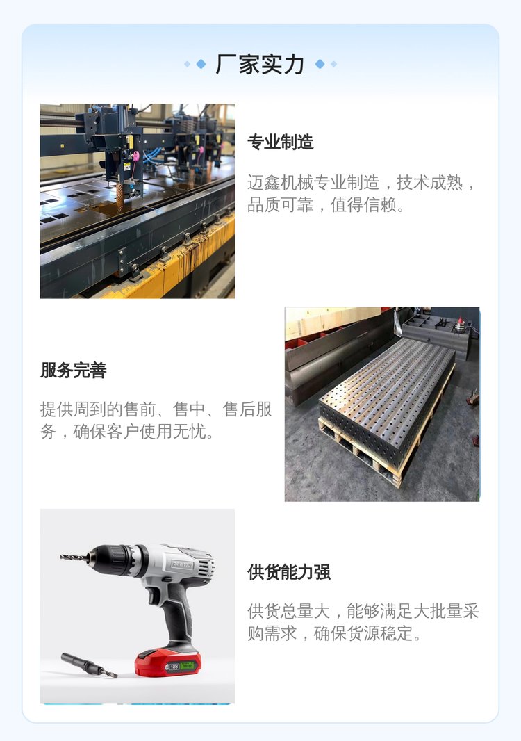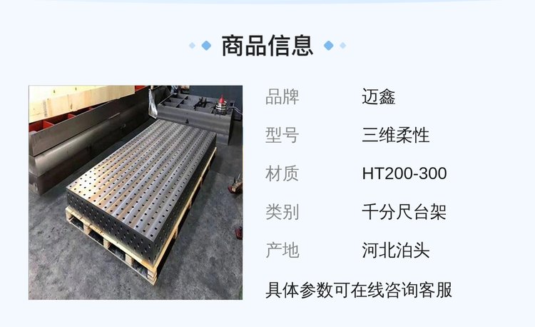 3、三维柔性组合焊接平台精度运用质量指三维柔性焊接工装平台铸件在不一样条件下的作业耐久能力,包括耐磨、耐腐蚀、耐激冷激热、疲劳、吸震等功能以及切削性、可焊性等工艺功能。