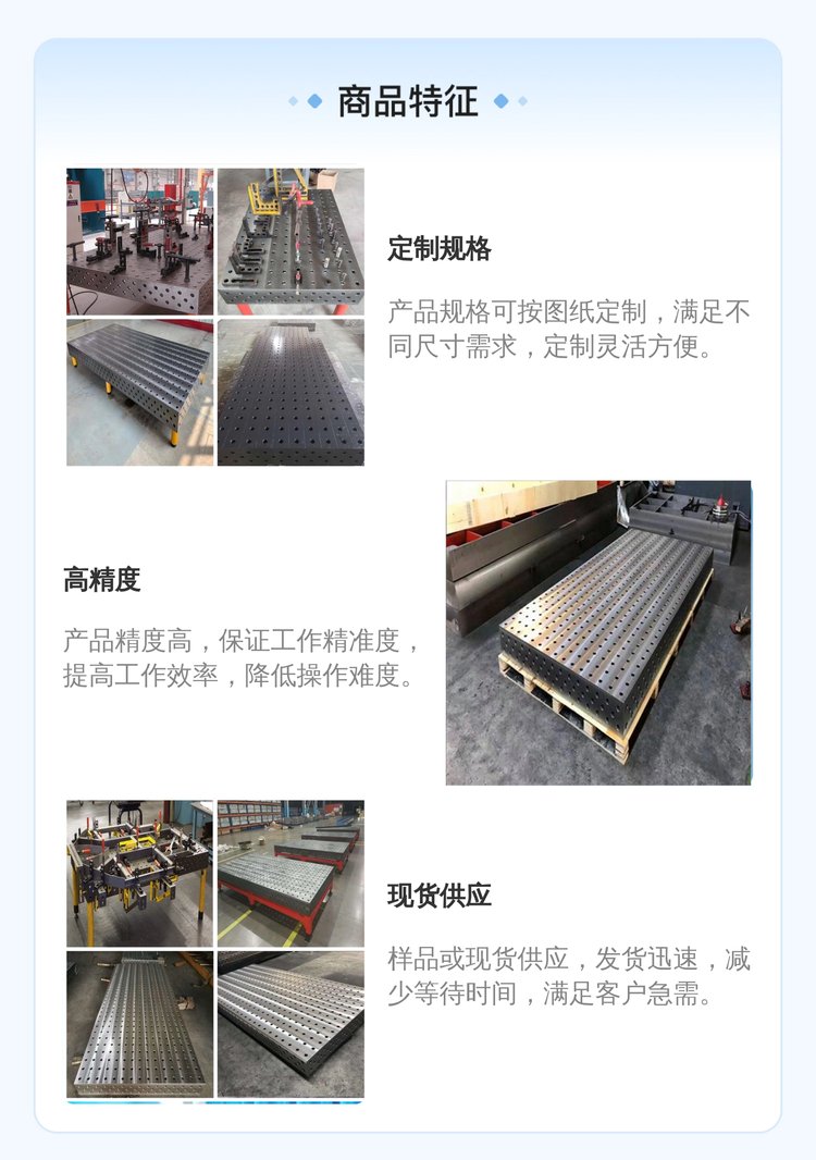 6、三维柔性组合焊接平台不用时要及时将工作面洗净,然后涂上一层防锈油,并用防锈纸盖上,用铸铁平板的外包装将铸铁平板盖好,以防止平时不注意造成对铸铁平板工作面的损伤。