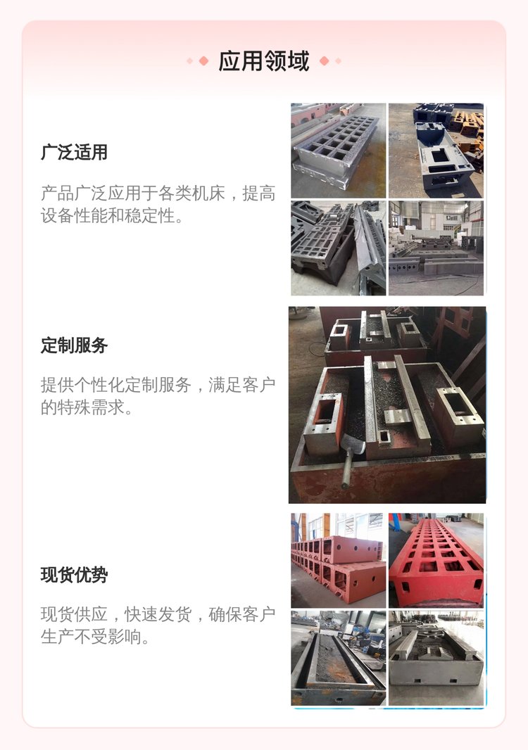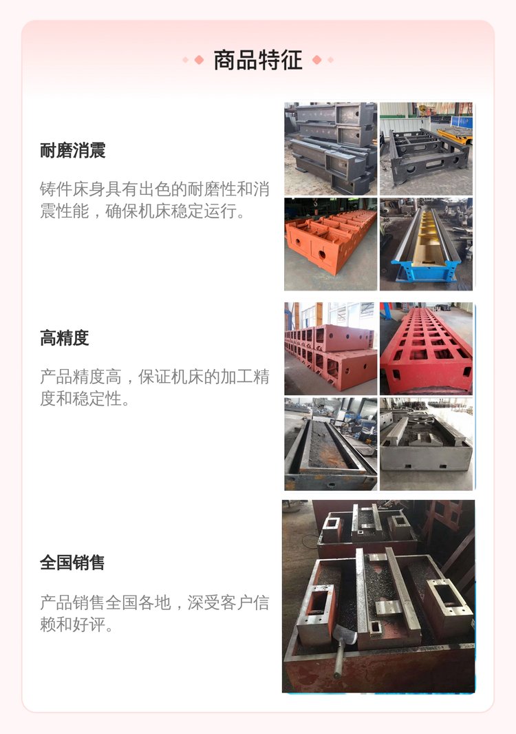 机床铸件床身的特点:⑴耐磨性与消震性好。⑵工艺性能好。由于灰口铸铁含碳量高,接近于共晶成分,故熔点比较低,流动性良好,收缩率小,因此适宜于铸造结构复杂或薄壁铸件。另外,由于石墨使切削加工时易于形成断屑,所以灰口铸铁的可切削加工性优于钢。7)商品描述: