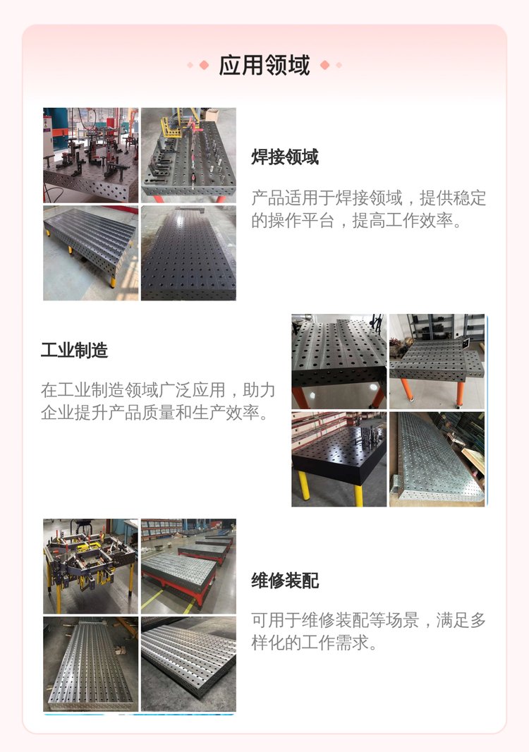 4、三维柔性组合焊接平台使用时要轻拿轻放工件,不要在铸铁平板上挪动比较粗糙的工件,以免对铸铁平板工作面造成磕碰、划伤等损坏。